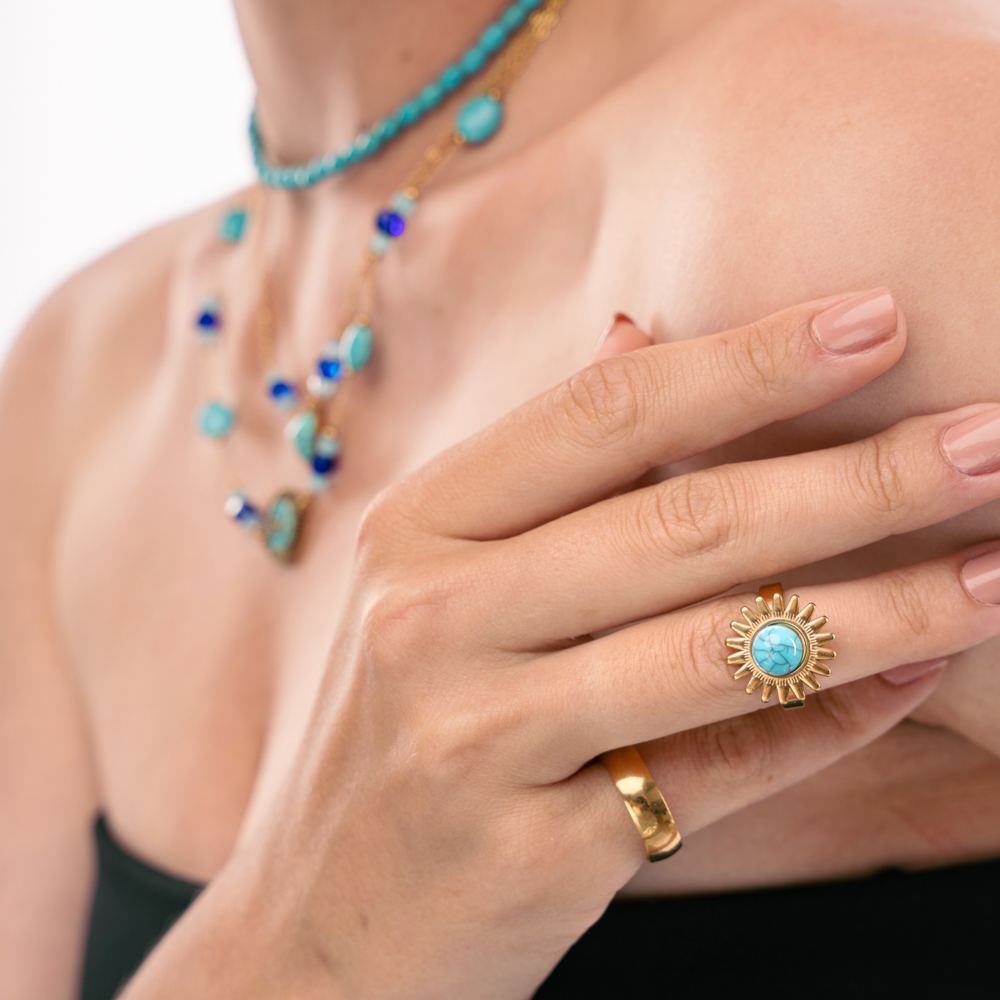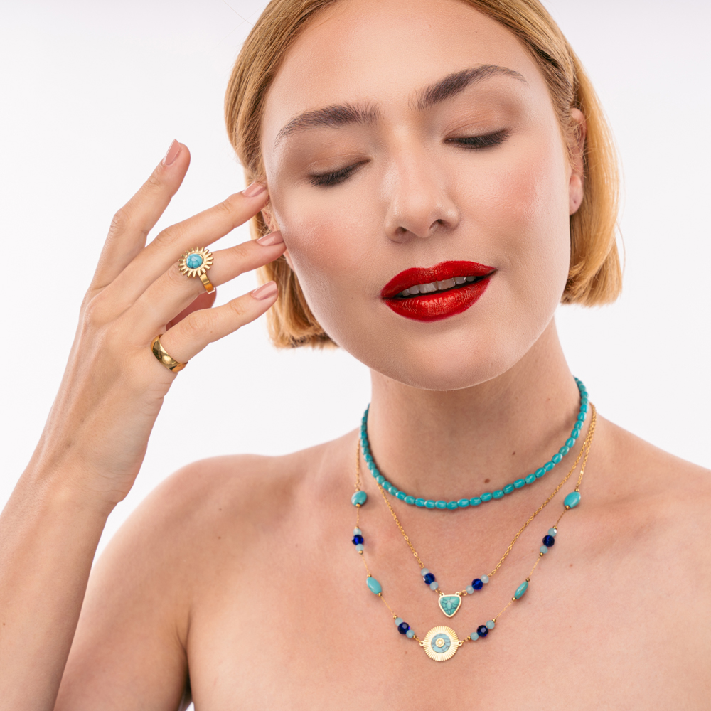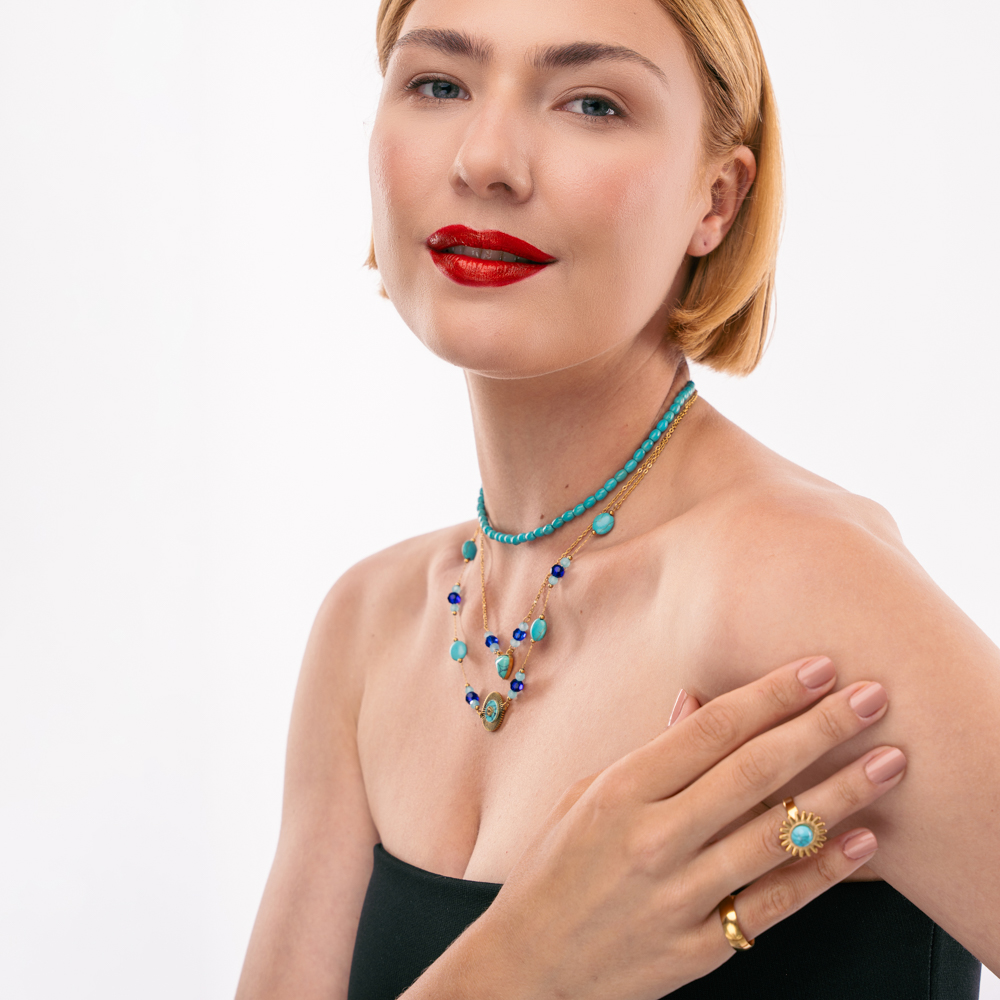 Κολιέ τριπλό με ημιπολύτιμες χάντρες σε χρώμα  μπλε και ατσάλινη αλυσίδα διπλή  με πέτρες ημιπολύτιμα  βότσαλα  σε όλες τις αποχρώσεις του μπλε και μοτίφ minimal μάτι