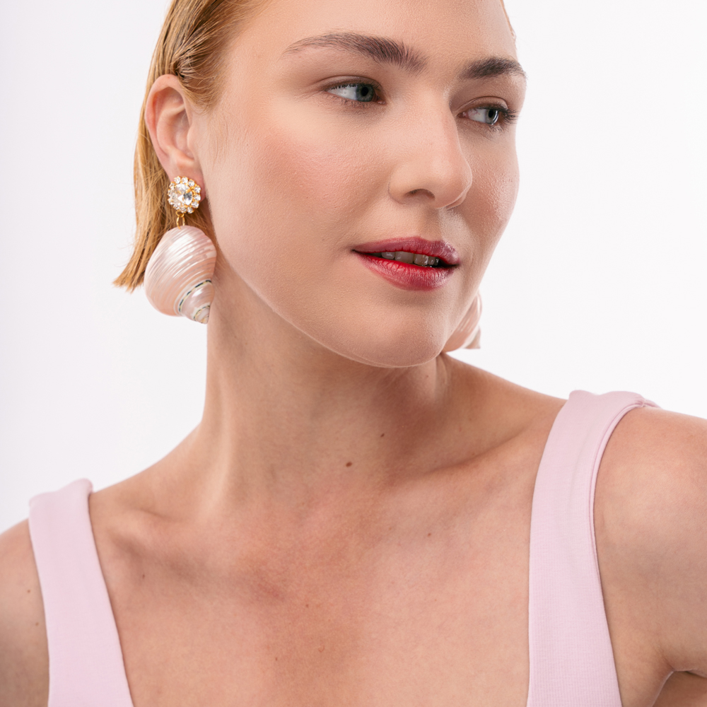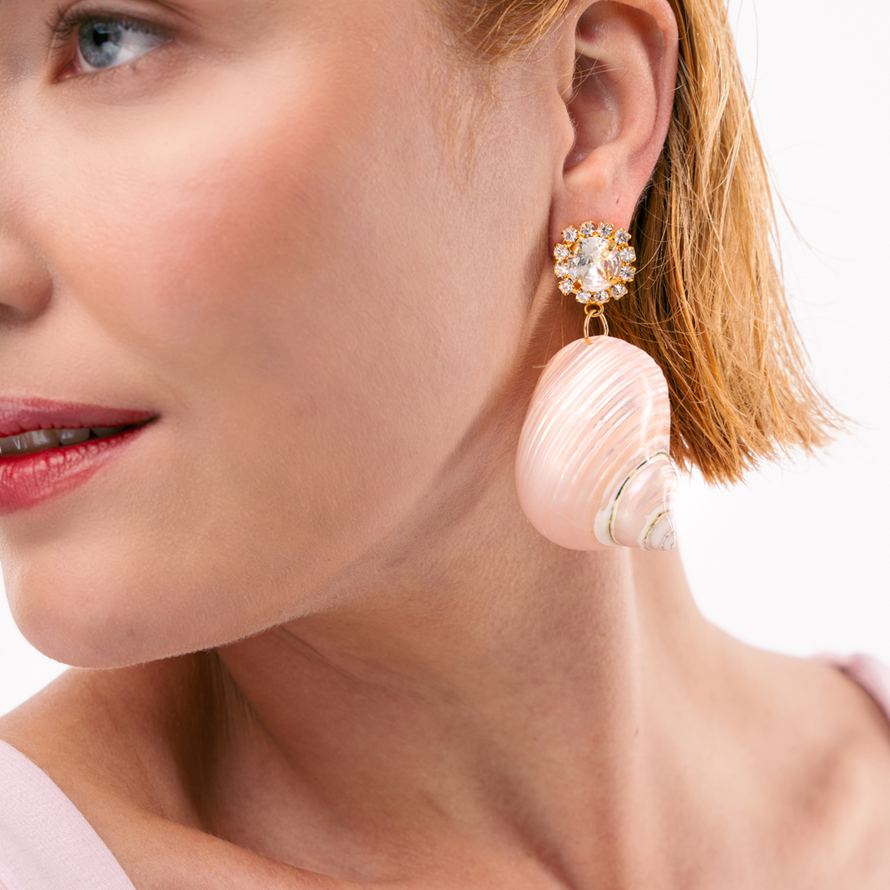 Σκουλαρίκια Κοχύλι σε ροζ περλέ χρώμα με κούμπωμα στρογγυλό στρας και περιμετρικά στρας σε χρώμα crystal