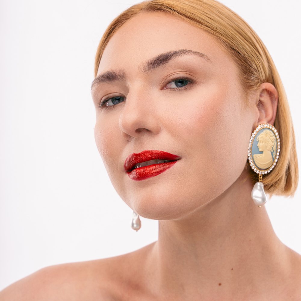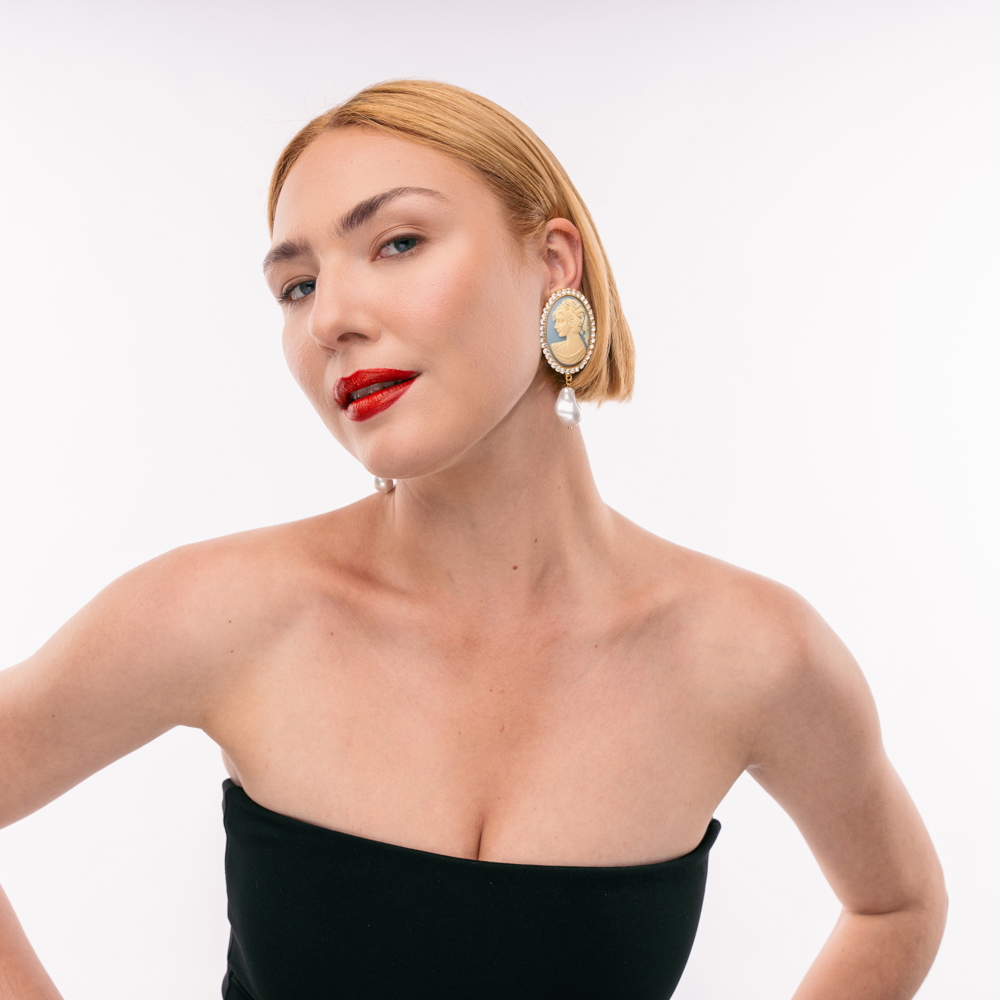 Σκουλαρίκια Elegant, vintage-inspired με μεταλλική βάση χρυσού τόνου, διακοσμημένο με συνθετικό cameo με λεπτομέρειες και τελείωμα με επεξεργασμένη ακανόνιστη Πέρλα συνθετική .